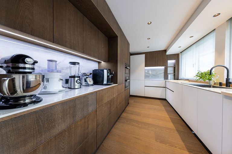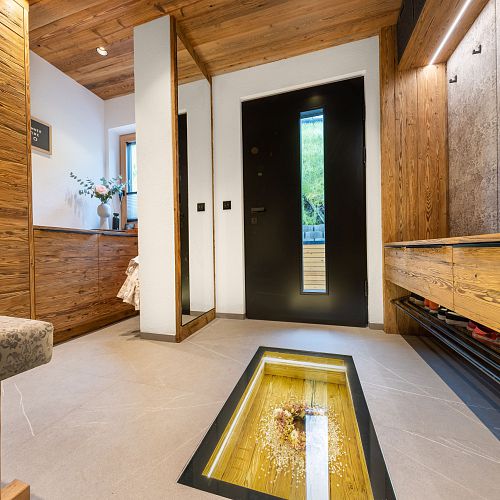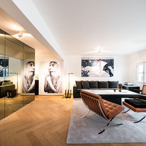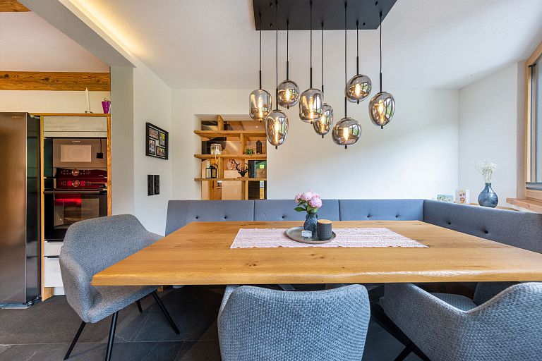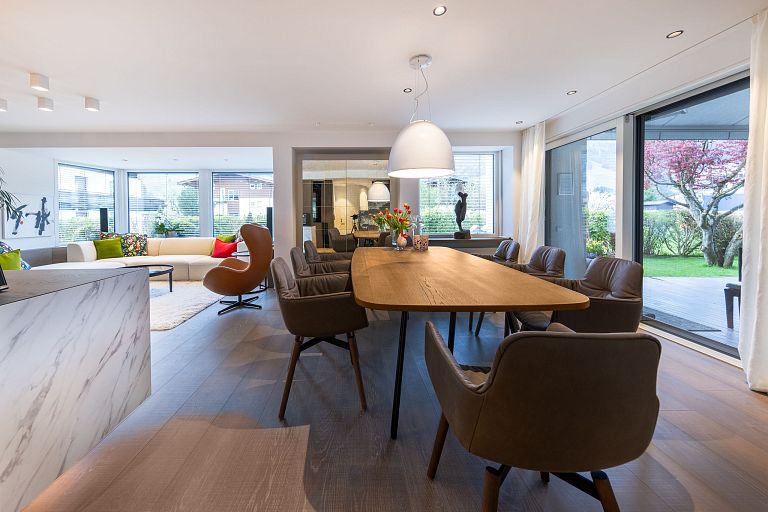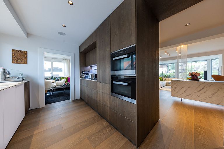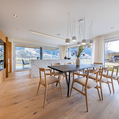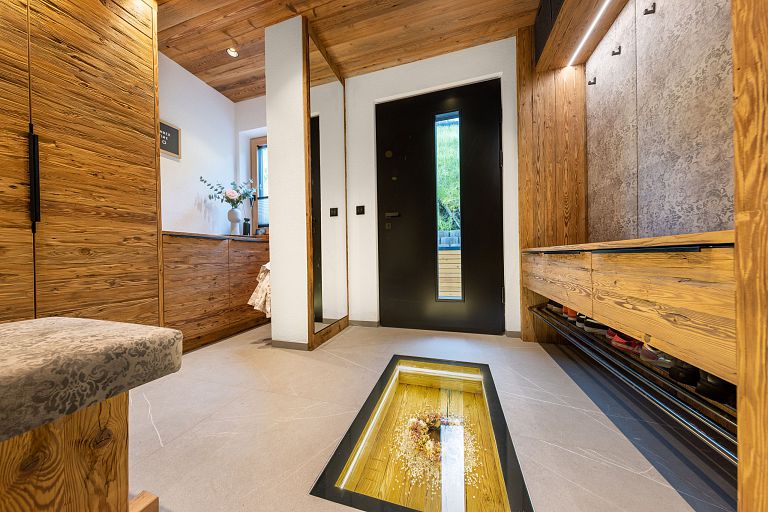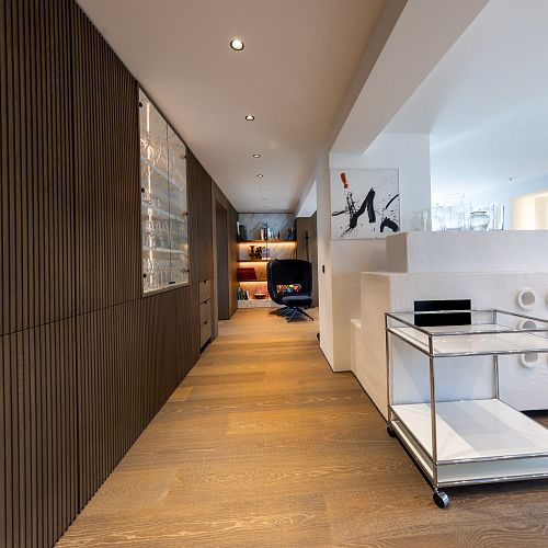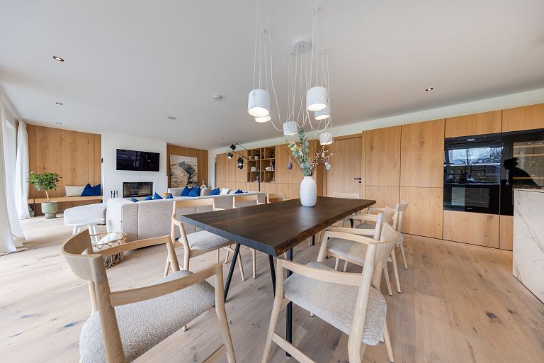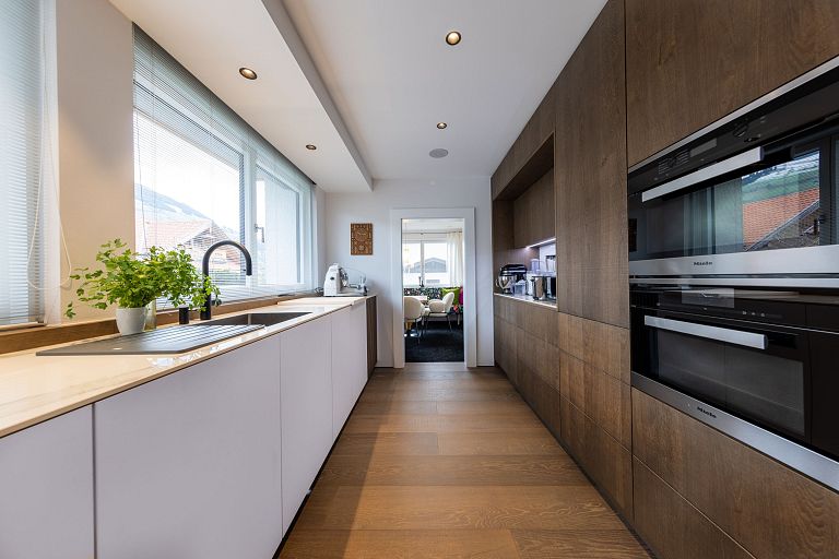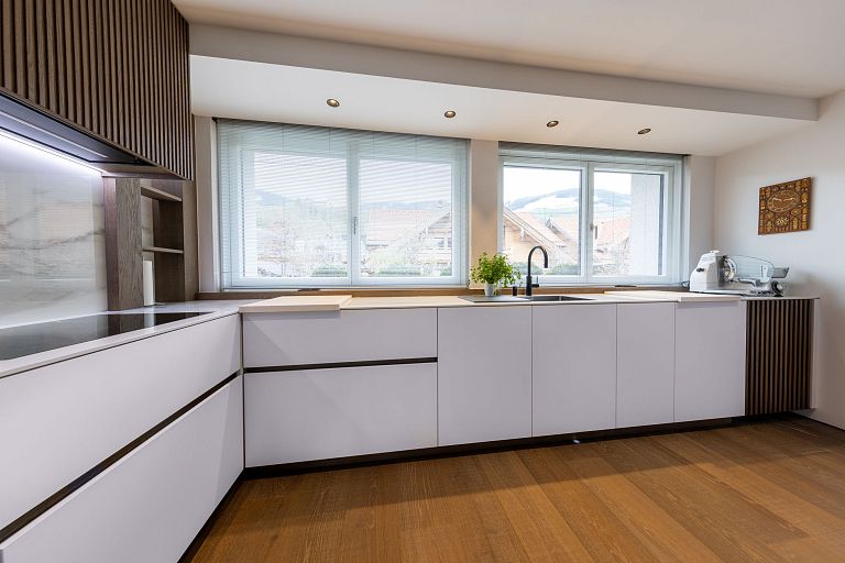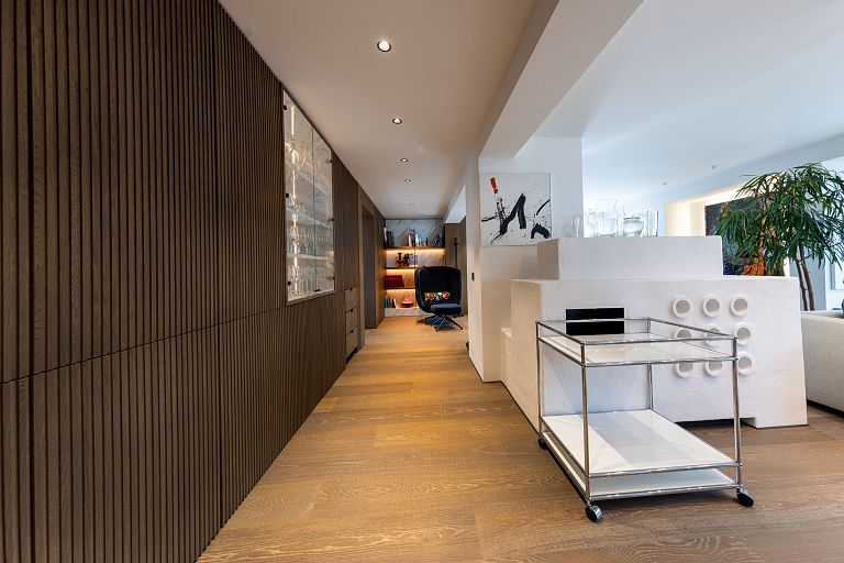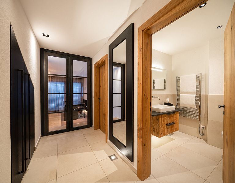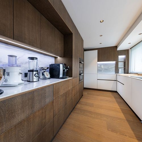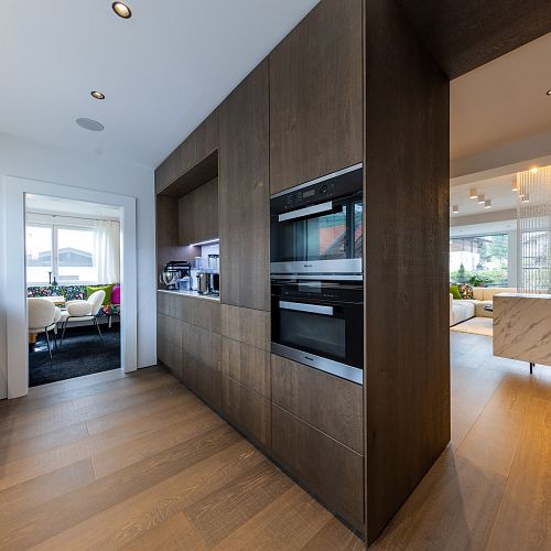 Bei diesem Projekt durften wir bei einem bestehenden Haus die komplette Innenraumgestaltung erneuern - samt neuer Raumaufteilung, Oberflächengestaltung und Möbeln. Von uns wurde der Abbruch, die Gipskartonarbeiten sowie die gesamten Bodenaufbauten erledigt. Weiters verlegten wir den Holzboden – und zwar angeräucherte, sägerauhe Breitdielen in Eiche. Ein besonderes Highlight ist der Raumteiler in dunkel gebeiztem Eichenholz mit klarer, geradliniger Lamellenstruktur. Ebenfalls Hingucker sind die Küche – eine Kombination aus glattem dunklen Eichenholz, weißen Fronten und Keramikarbeitsplatte sowie die Nischenschränke mit Antikspiegel und Carrara Marmor.