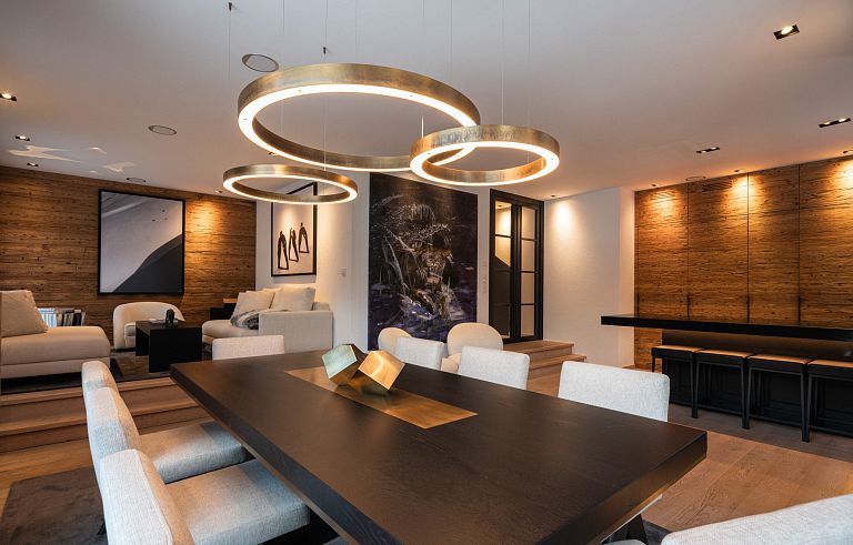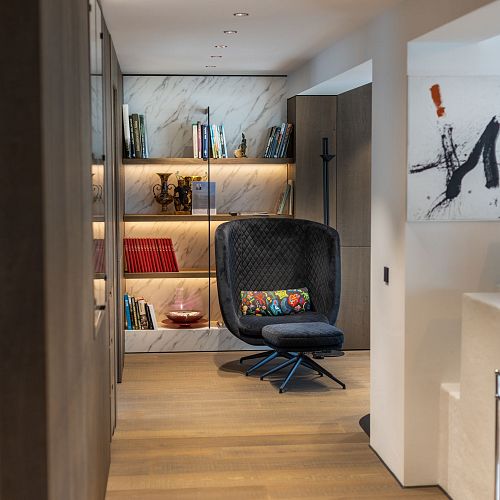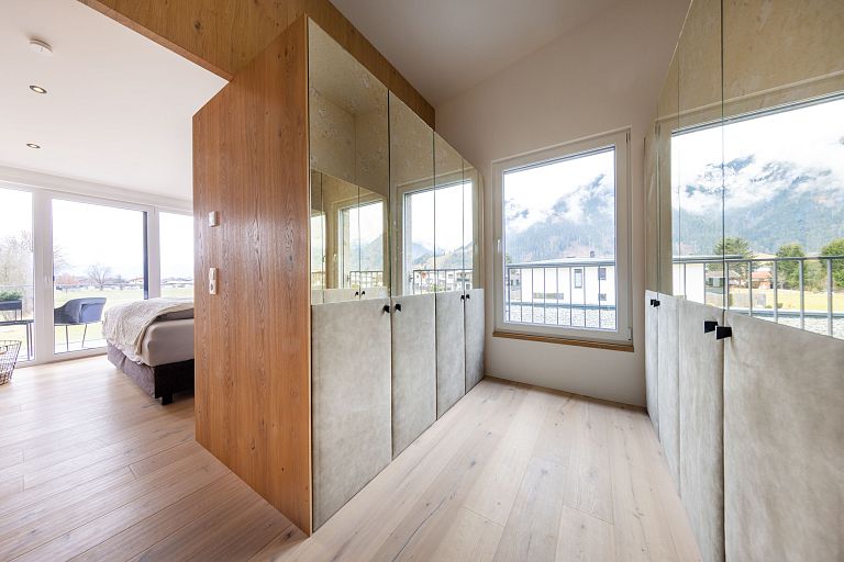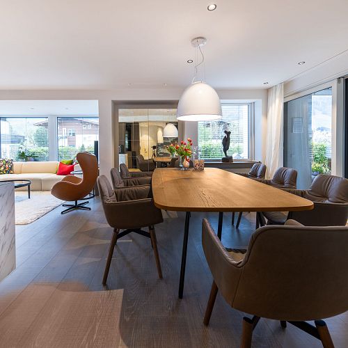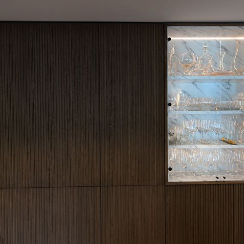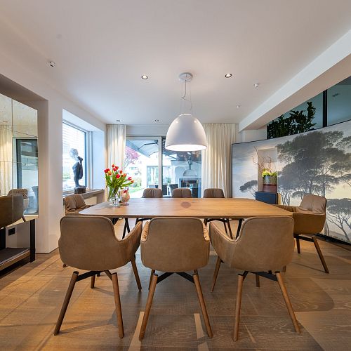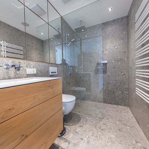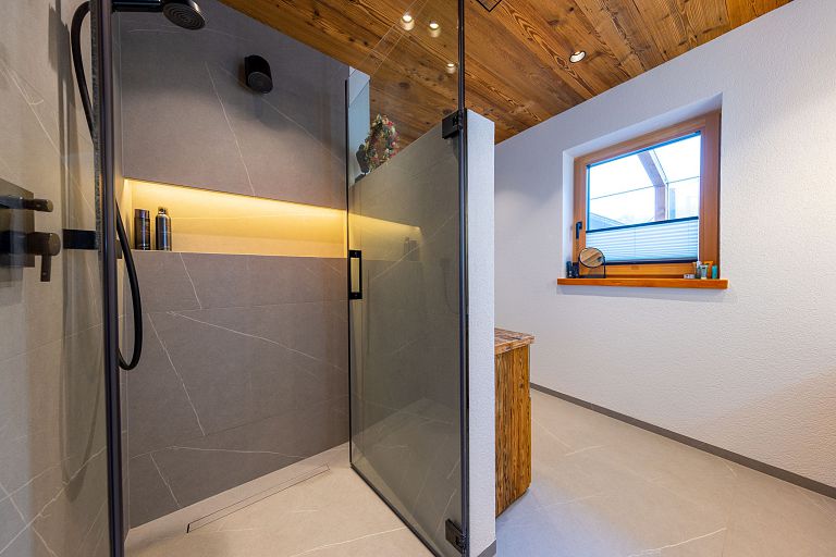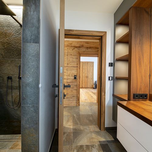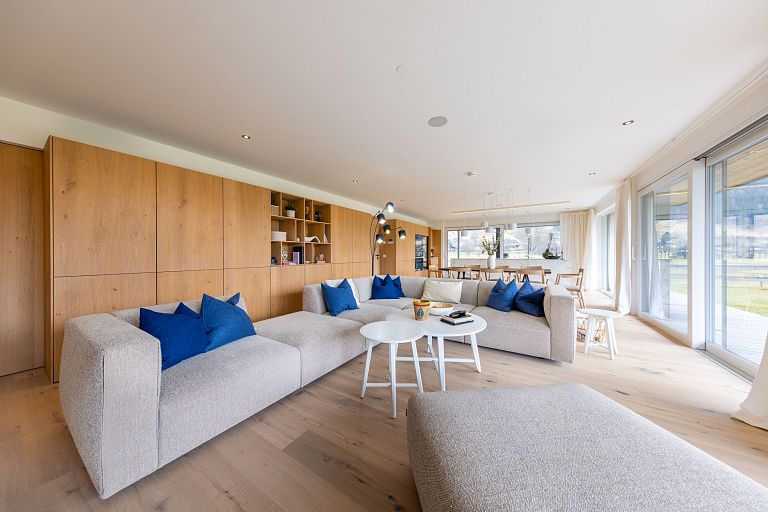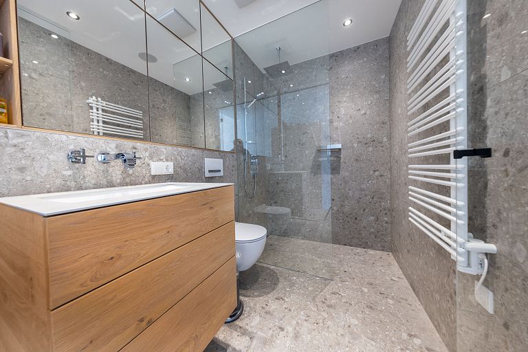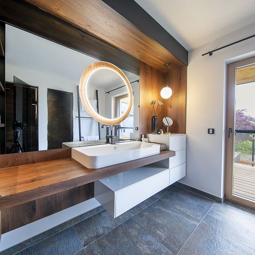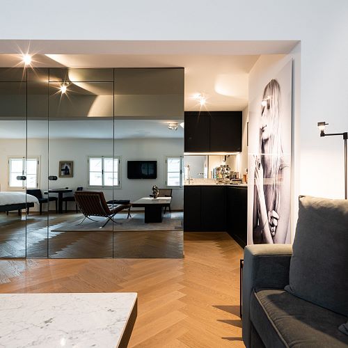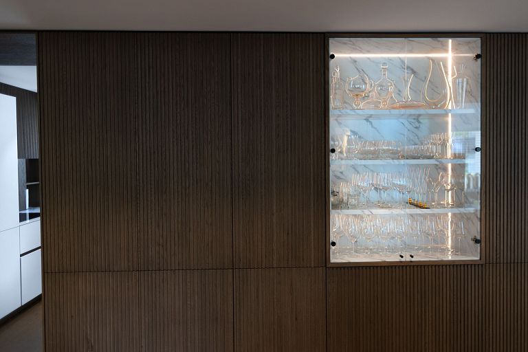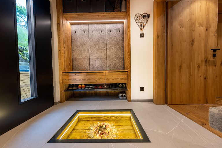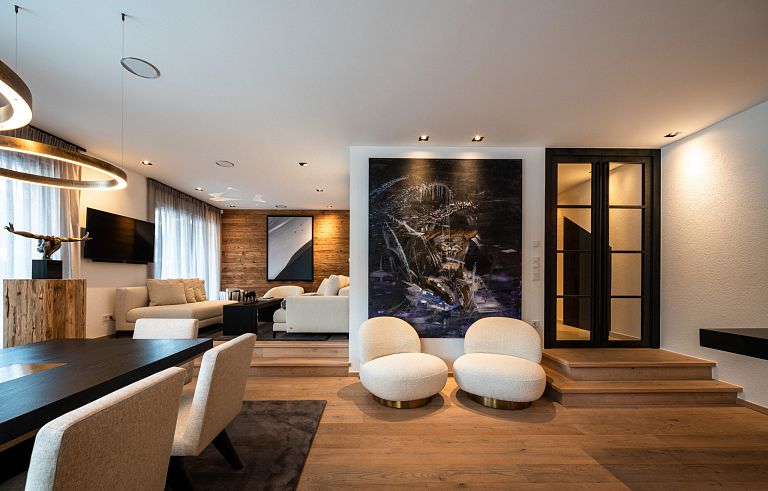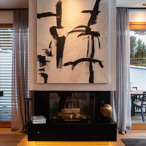 Bei diesem Projekt durften wir bei einem bestehenden Haus die komplette Innenraumgestaltung erneuern - samt neuer Raumaufteilung, Oberflächengestaltung und Möbeln. Von uns wurde der Abbruch, die Gipskartonarbeiten sowie die gesamten Bodenaufbauten erledigt. Weiters verlegten wir den Holzboden – und zwar angeräucherte, sägerauhe Breitdielen in Eiche. Ein besonderes Highlight ist der Raumteiler in dunkel gebeiztem Eichenholz mit klarer, geradliniger Lamellenstruktur. Ebenfalls Hingucker sind die Küche – eine Kombination aus glattem dunklen Eichenholz, weißen Fronten und Keramikarbeitsplatte sowie die Nischenschränke mit Antikspiegel und Carrara Marmor.