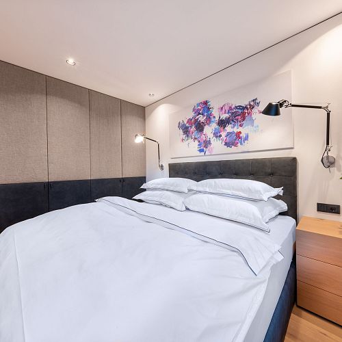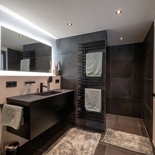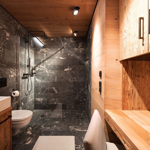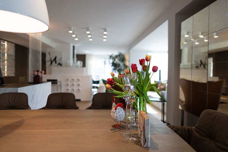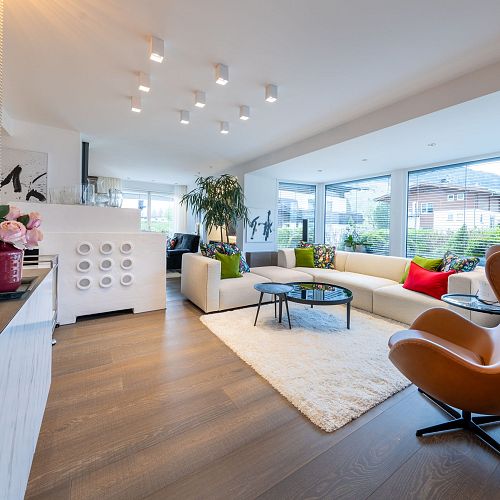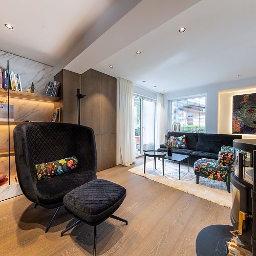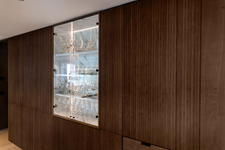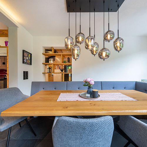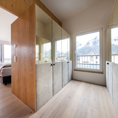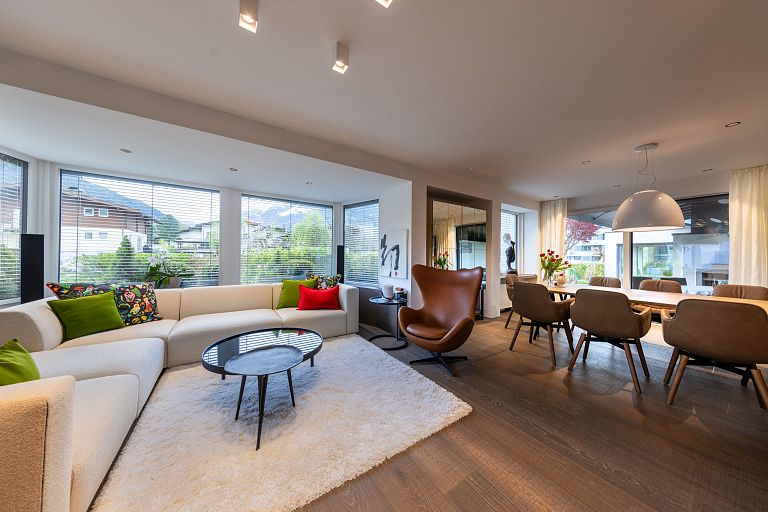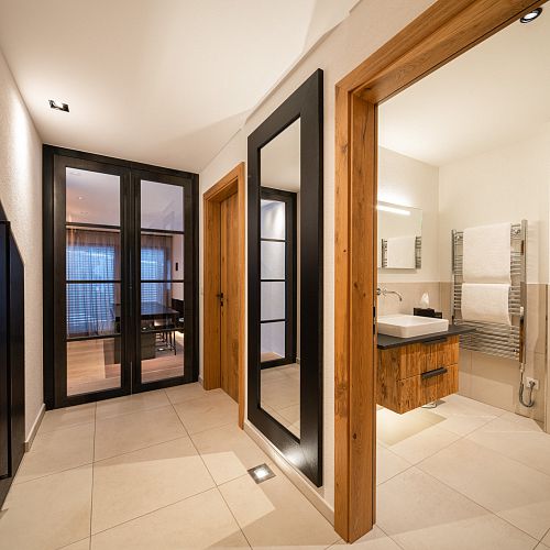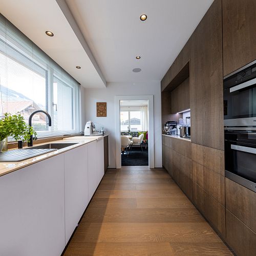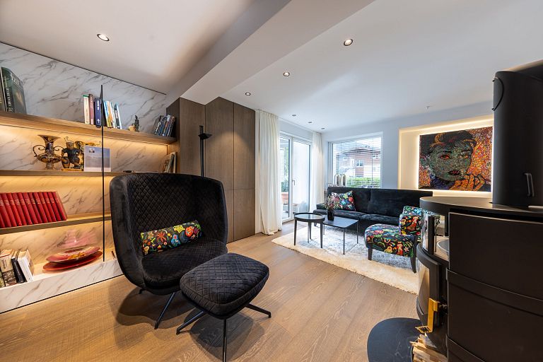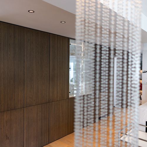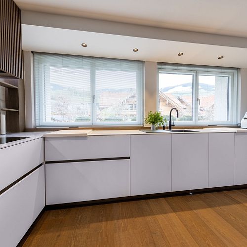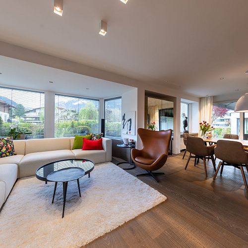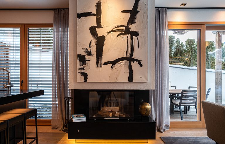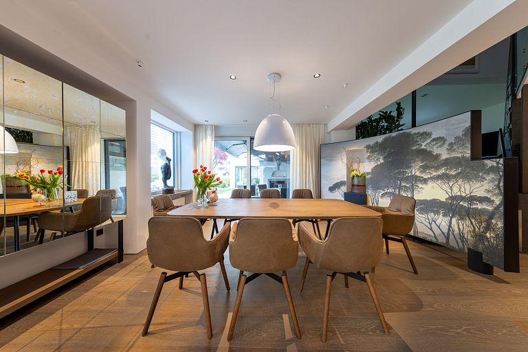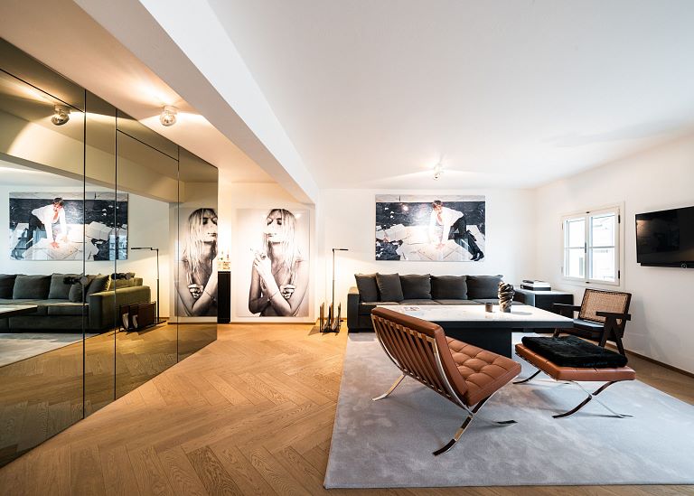 Bei diesem Projekt durften wir bei einem bestehenden Haus die komplette Innenraumgestaltung erneuern - samt neuer Raumaufteilung, Oberflächengestaltung und Möbeln. Von uns wurde der Abbruch, die Gipskartonarbeiten sowie die gesamten Bodenaufbauten erledigt. Weiters verlegten wir den Holzboden – und zwar angeräucherte, sägerauhe Breitdielen in Eiche. Ein besonderes Highlight ist der Raumteiler in dunkel gebeiztem Eichenholz mit klarer, geradliniger Lamellenstruktur. Ebenfalls Hingucker sind die Küche – eine Kombination aus glattem dunklen Eichenholz, weißen Fronten und Keramikarbeitsplatte sowie die Nischenschränke mit Antikspiegel und Carrara Marmor.