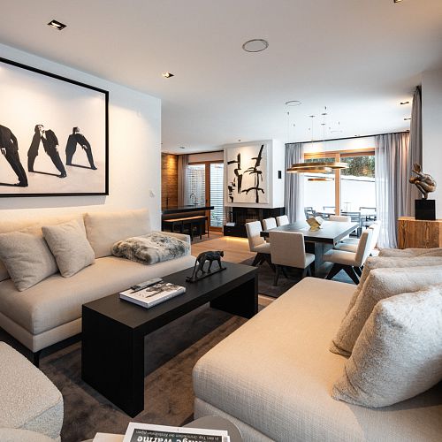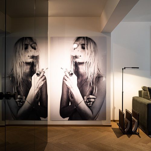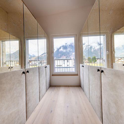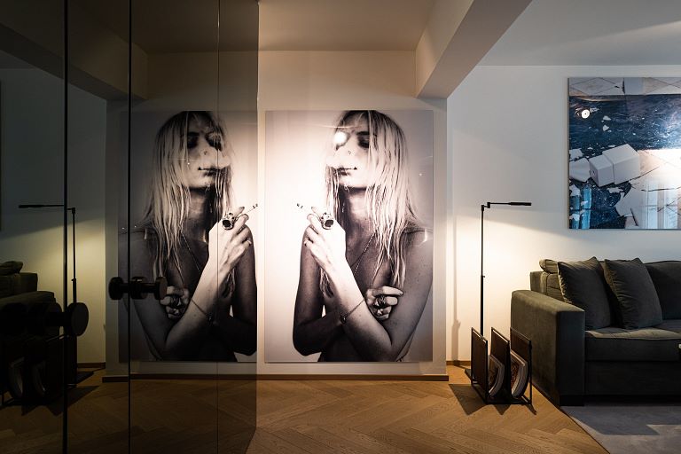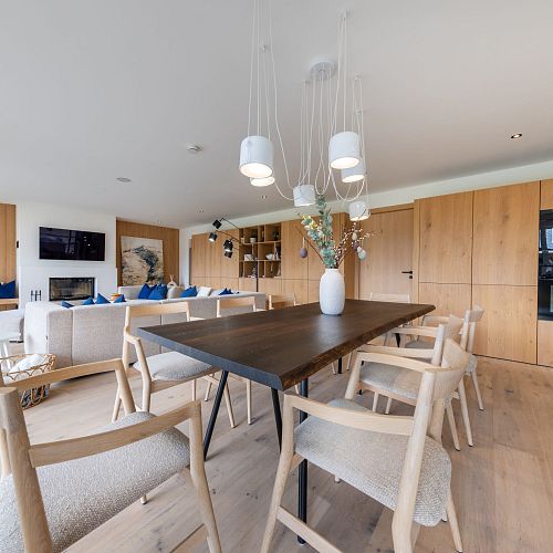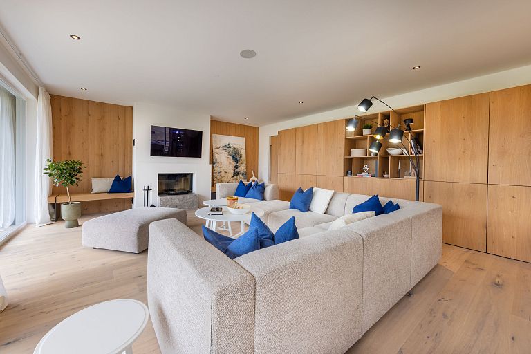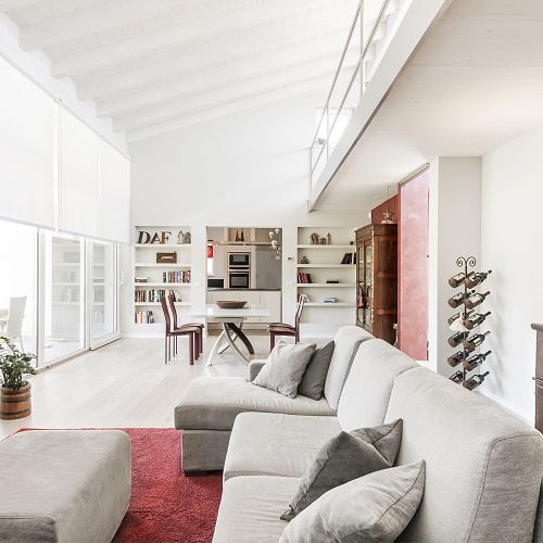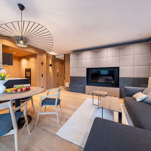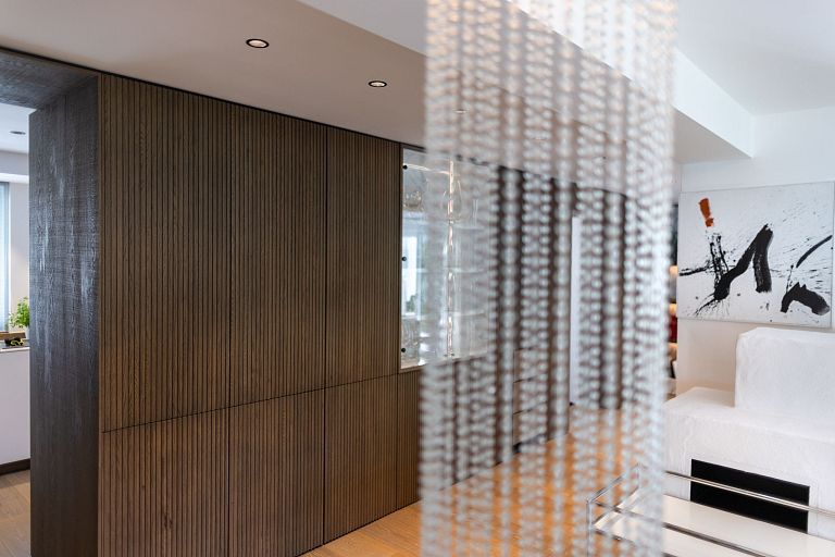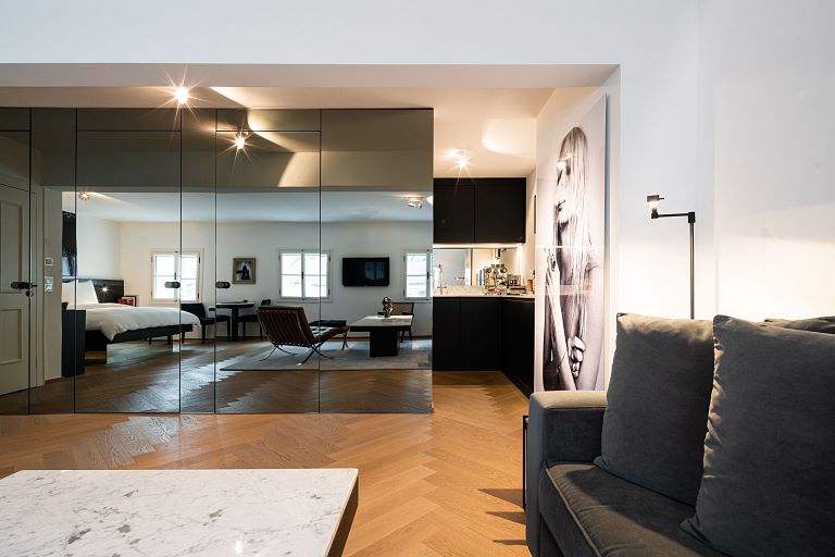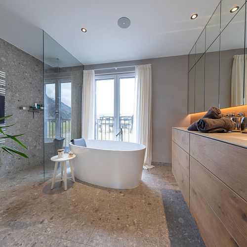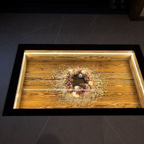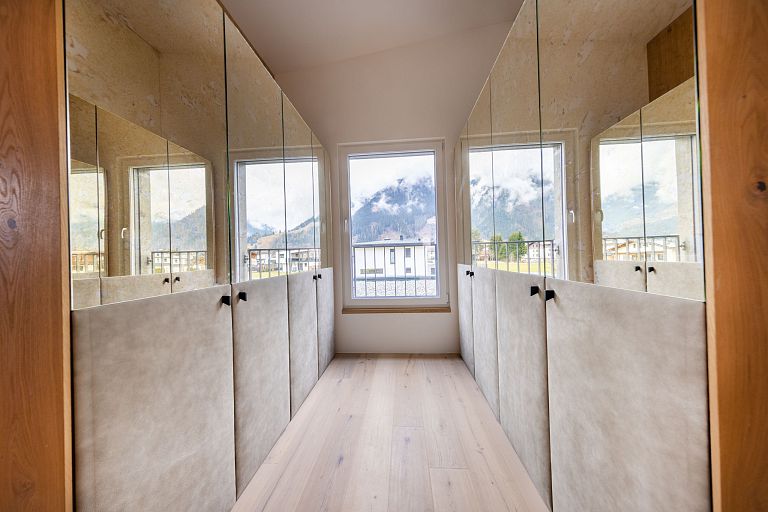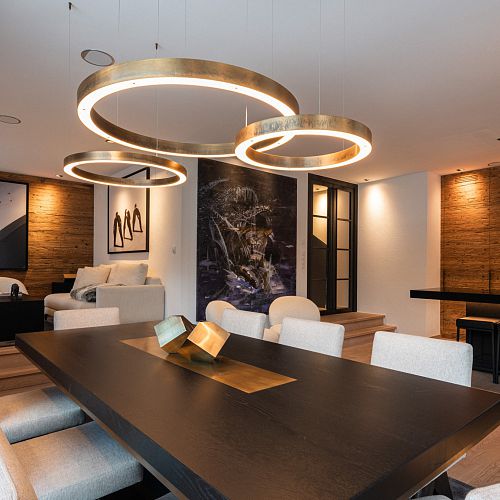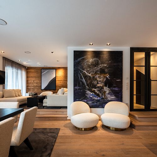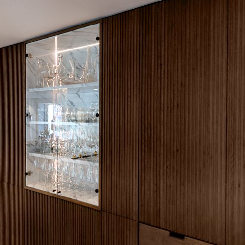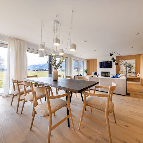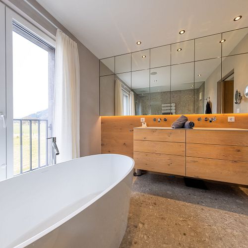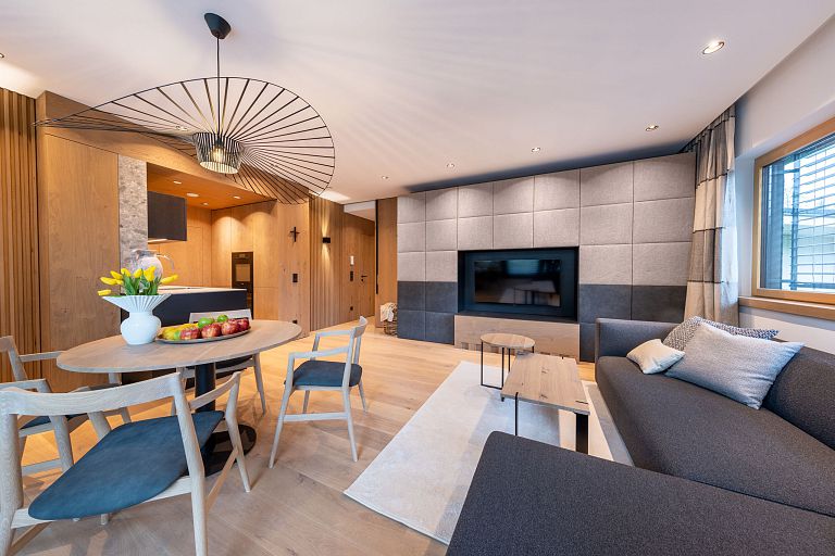 Bei diesem Projekt durften wir bei einem bestehenden Haus die komplette Innenraumgestaltung erneuern - samt neuer Raumaufteilung, Oberflächengestaltung und Möbeln. Von uns wurde der Abbruch, die Gipskartonarbeiten sowie die gesamten Bodenaufbauten erledigt. Weiters verlegten wir den Holzboden – und zwar angeräucherte, sägerauhe Breitdielen in Eiche. Ein besonderes Highlight ist der Raumteiler in dunkel gebeiztem Eichenholz mit klarer, geradliniger Lamellenstruktur. Ebenfalls Hingucker sind die Küche – eine Kombination aus glattem dunklen Eichenholz, weißen Fronten und Keramikarbeitsplatte sowie die Nischenschränke mit Antikspiegel und Carrara Marmor.