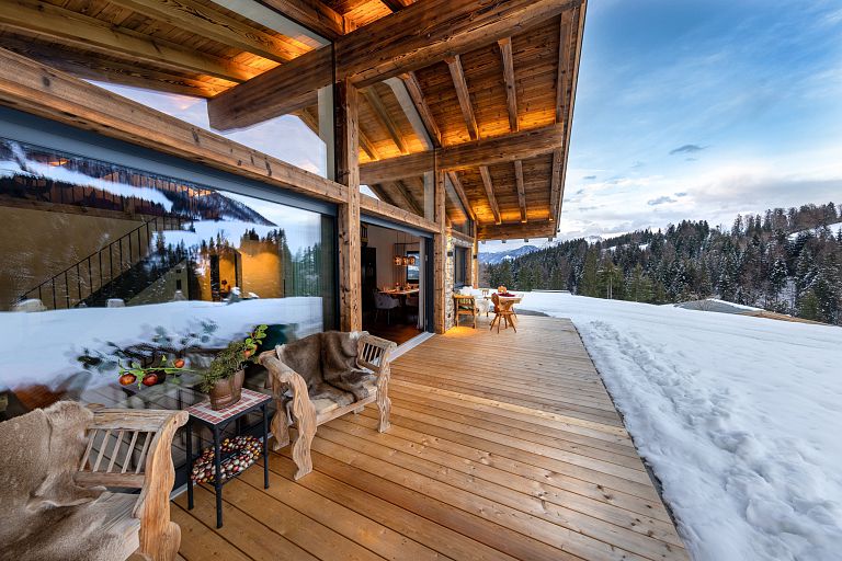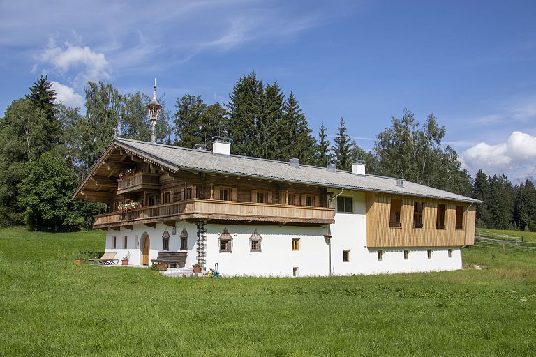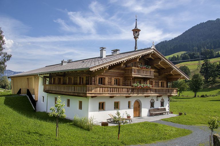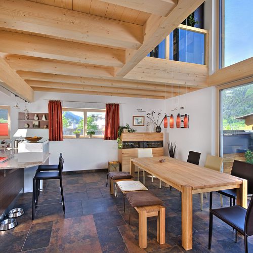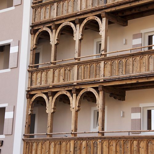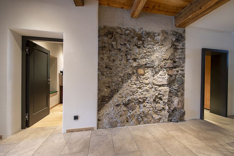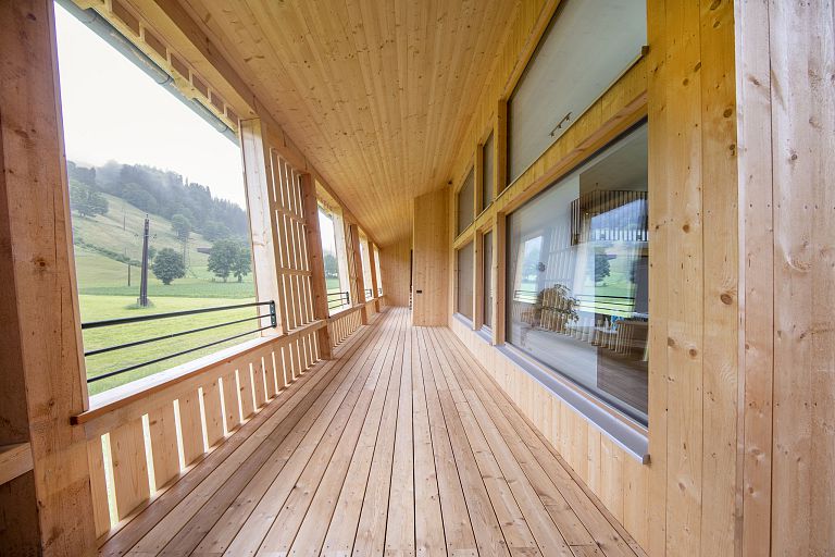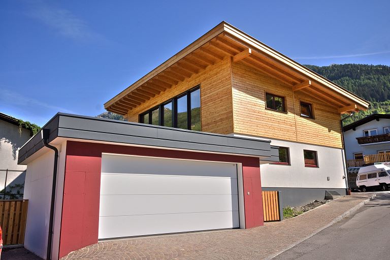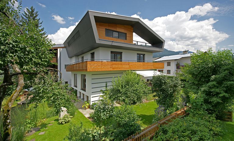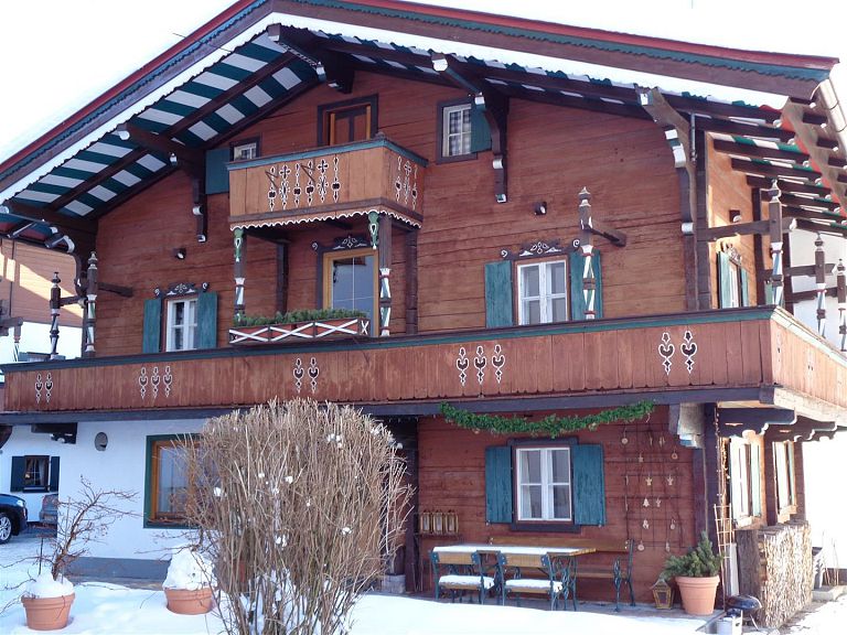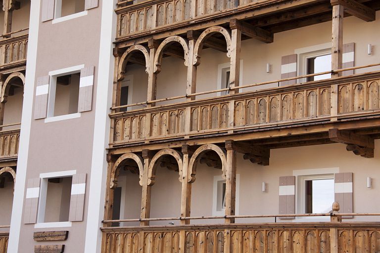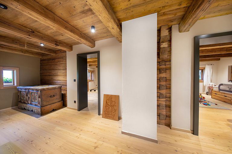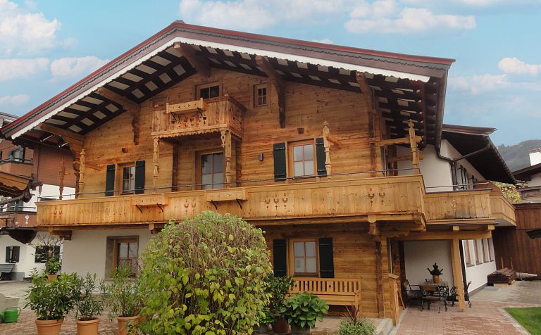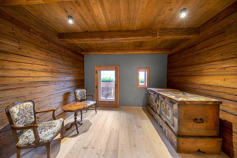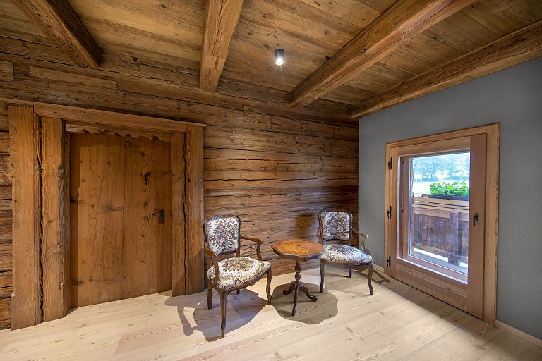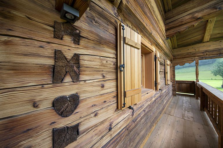Die Fassade, die Balkone und die Windläden sind in Altholz und Fichte kombiniert mit traditionellen Tiroler Schweifungen und Verzierungen. Die Fenster und Balkontüren wurden in geöltem Lärchenholz ausgeführt. Die alten Holzböden wurden abgetragen , aufbereitet und als Sichtschalung bei den neuen Holzdecken wiederverwendet.
