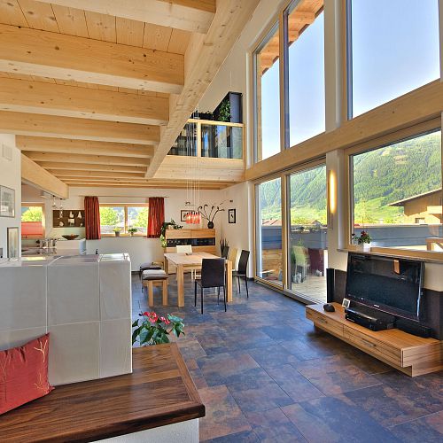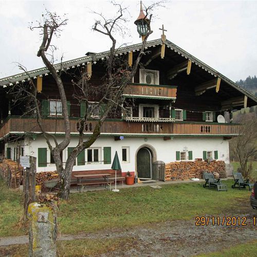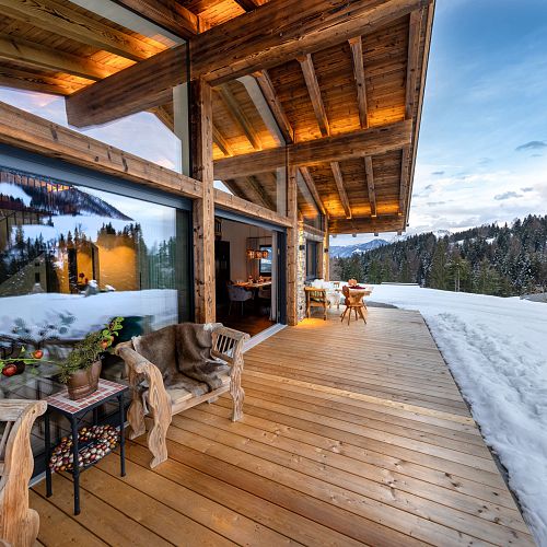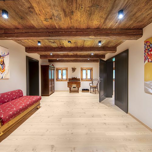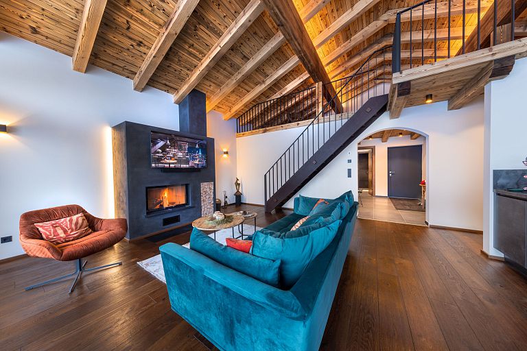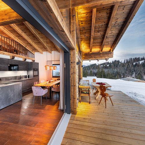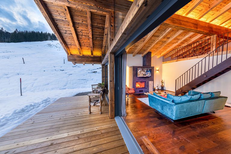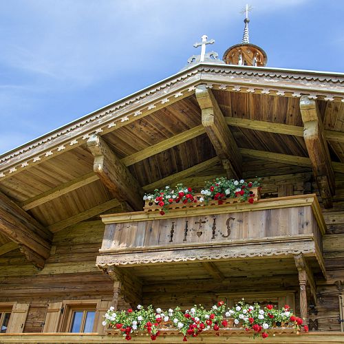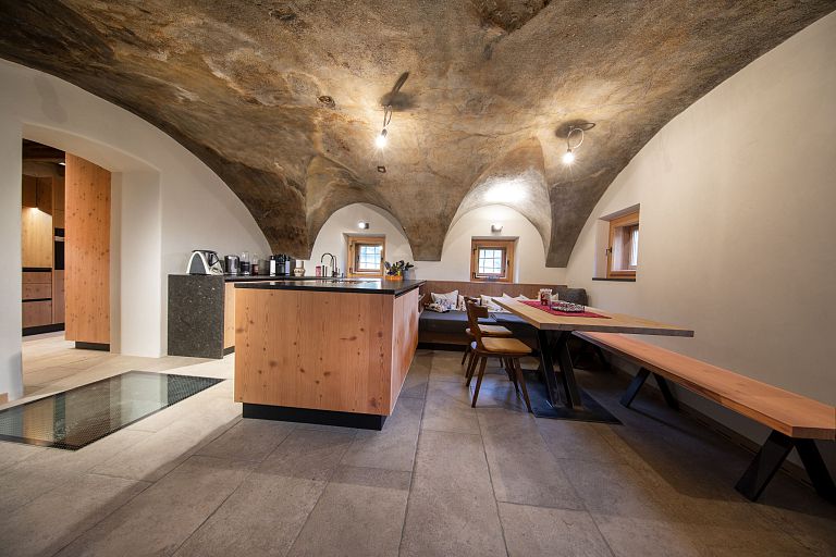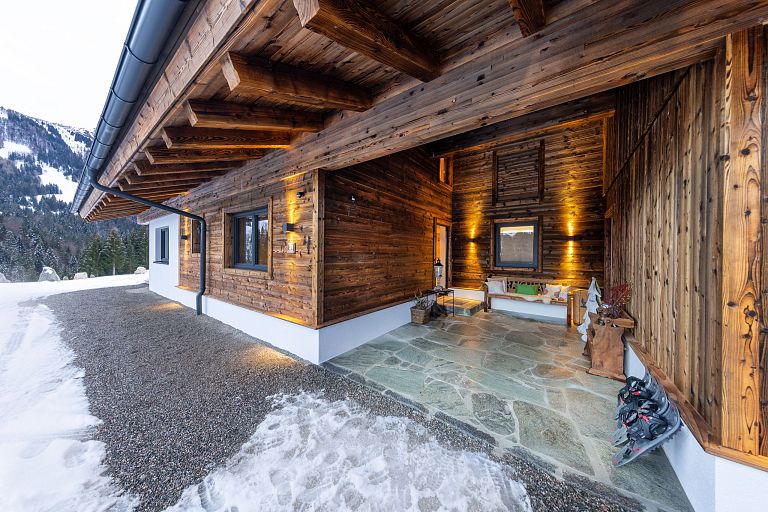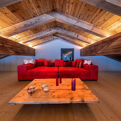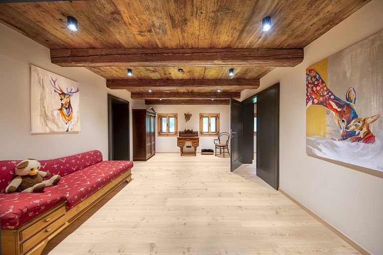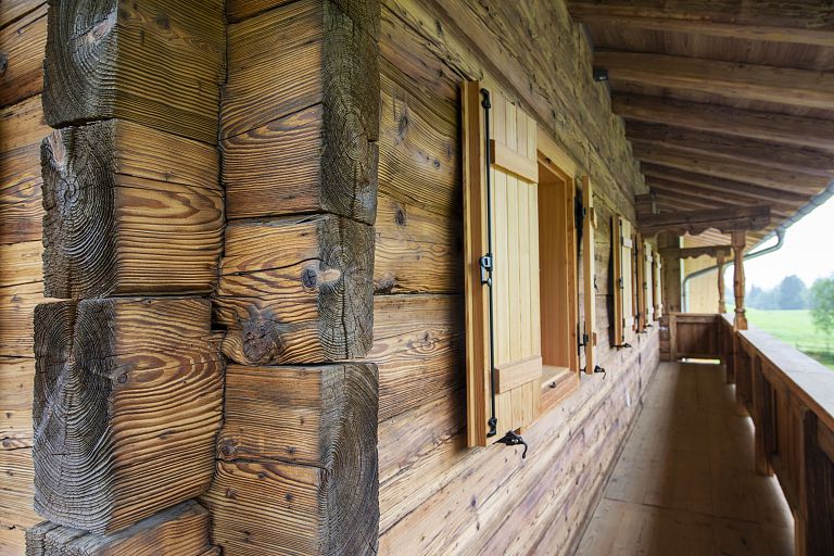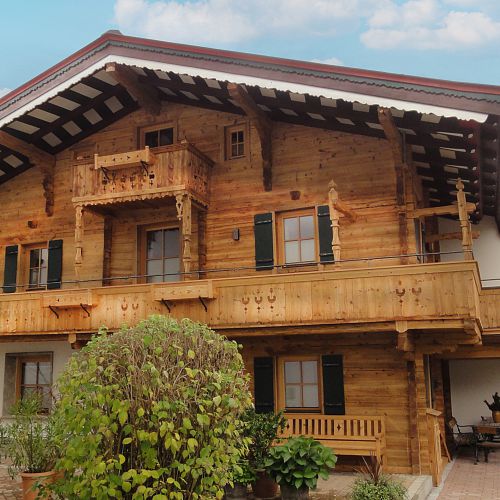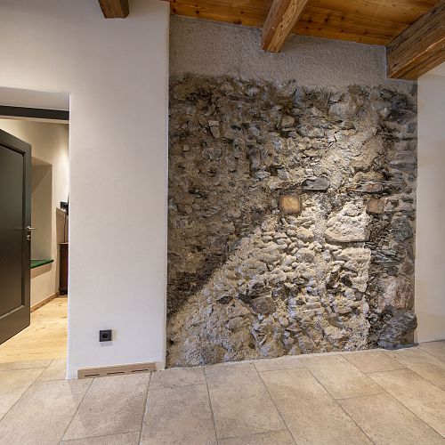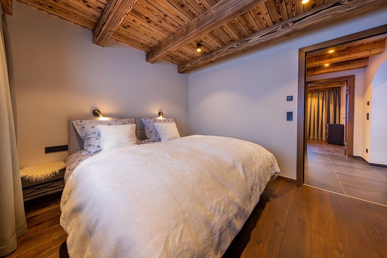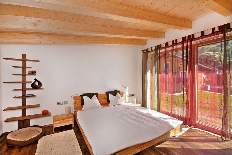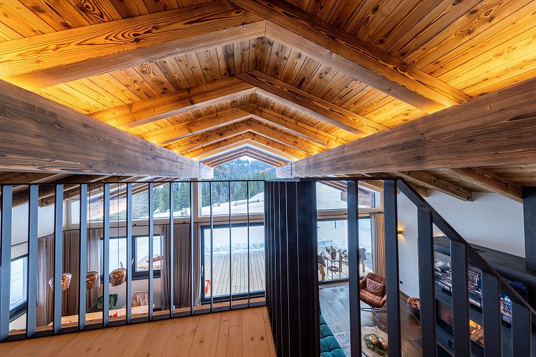 Die Fassade, die Balkone und die Windläden sind in Altholz und Fichte kombiniert mit traditionellen Tiroler Schweifungen und Verzierungen. Die Fenster und Balkontüren wurden in geöltem Lärchenholz ausgeführt. Die alten Holzböden wurden abgetragen , aufbereitet und als Sichtschalung bei den neuen Holzdecken wiederverwendet.