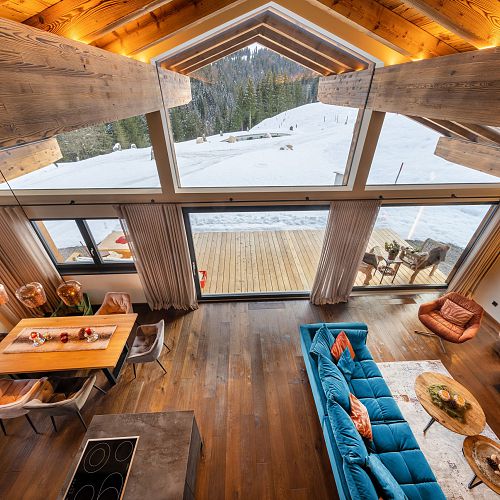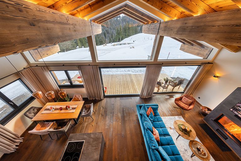 Das bestehende Almgebäude wurde abgerissen und ein neues, modernes Almgebäude errichtet. Die Konstruktion erfolge in vorgfertigten Holzriegelelementen. Die großen Fensterelemente sind aus witterungsbetändiger Holz - Alukonstruktion. Die Holzverkleidungen Innen und Außen wurden aus gebranntem und gewaschenem Fichtenholz ausgeführt. Die Böden und Innentüren in Eichenholz und die Treppenkonstruktion samt Geländer in edelm Schwarzstahl.
