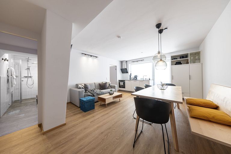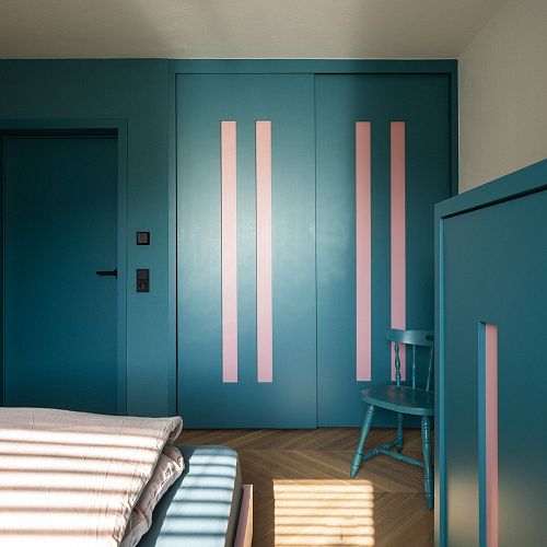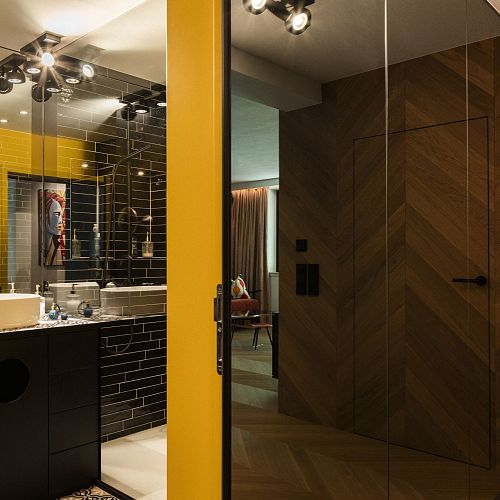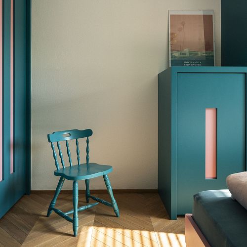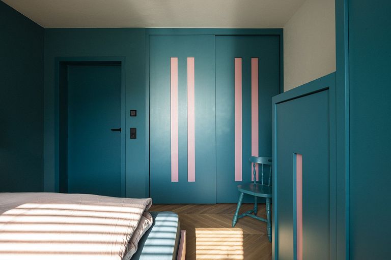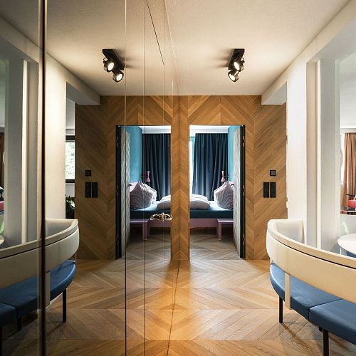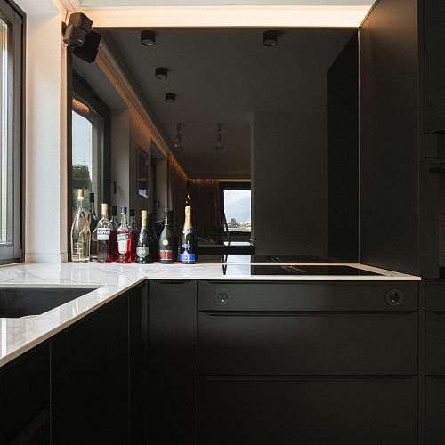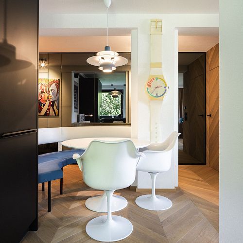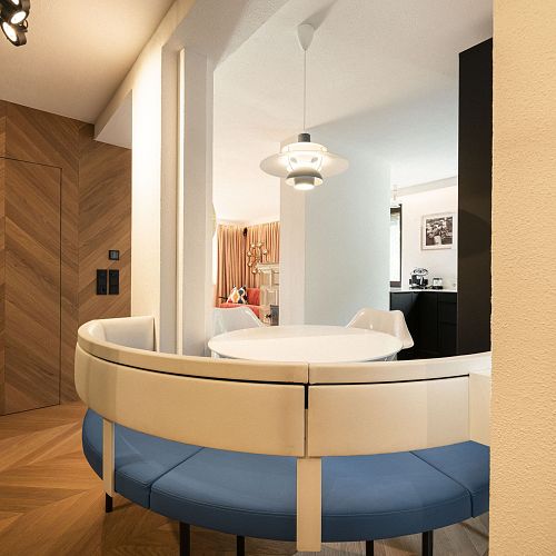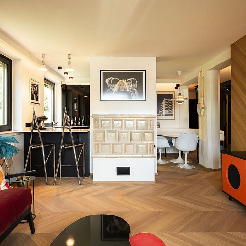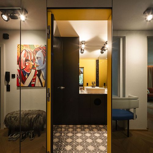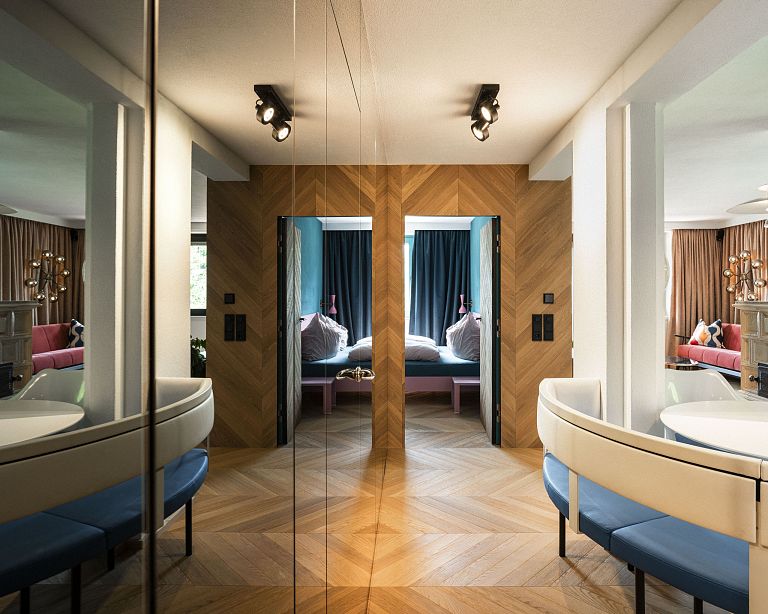 Eine umfassende Generalsanierung einer Wohnung in Mittersill inklusive vollständiger Einrichtung. Dank einer Spiegelwand mit „Tapeten-Spiegeltüren“ verschwindet die Wand optisch, wodurch der Zugangsbereich sowie der Ess-, Küchen- und Wohnbereich deutlich vergrößert wirken. Der Eichen-Fischgrätparkett setzt sich auch als Wandverkleidung im Wohnbereich fort und verleiht dem Raum eine warme Atmosphäre. Die Küche überzeugt durch ein elegantes Zusammenspiel aus Schwarz und weißem Marmor. Das „fensterlose“ Badezimmer strahlt durch seine sonnengelbe Farbe Helligkeit und Frische aus. Im Schlafzimmer werden die vorhandenen Möbel mit neuen Oberflächen veredelt. Durch die warmen Türkis- und Rosatöne wird es zur gemütlichen „Schlafhöhle“. Die Möbel sind im Stil der 70er Jahre gehalten. Jeder Raum hat sein eigenes, individuelles Farbkonzept.