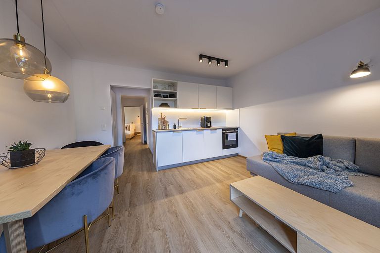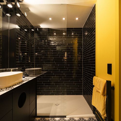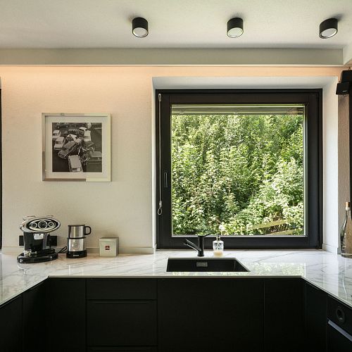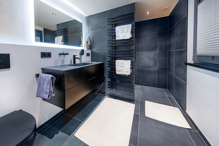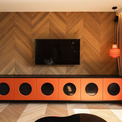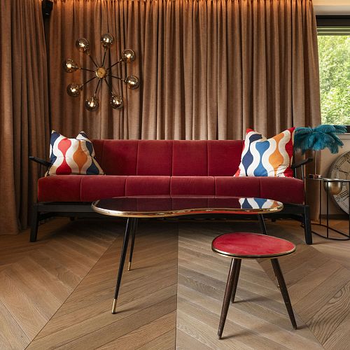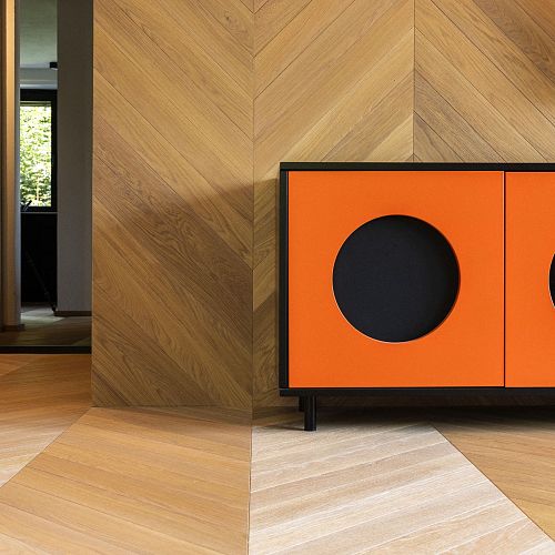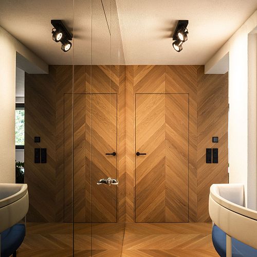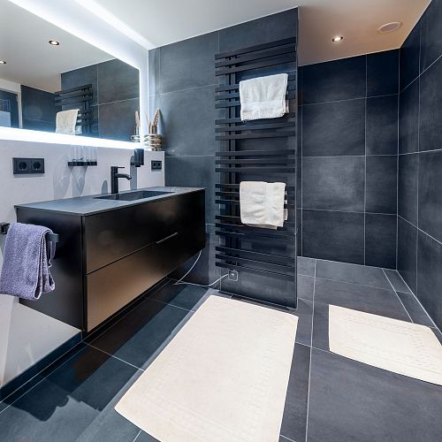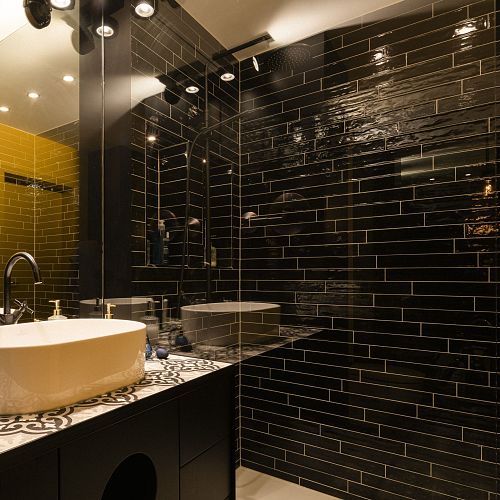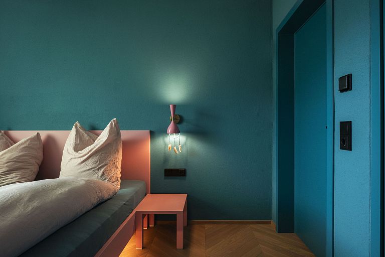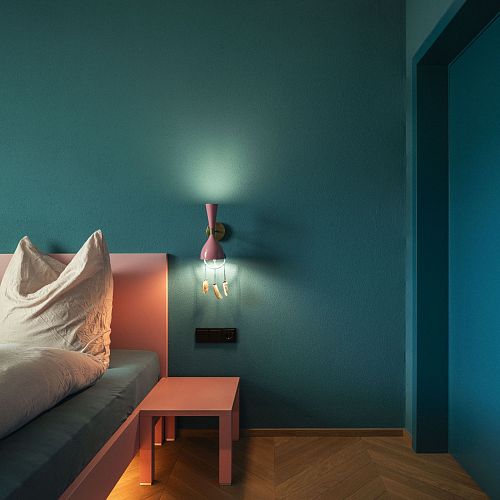 Eine umfassende Generalsanierung einer Wohnung in Mittersill inklusive vollständiger Einrichtung. Dank einer Spiegelwand mit „Tapeten-Spiegeltüren“ verschwindet die Wand optisch, wodurch der Zugangsbereich sowie der Ess-, Küchen- und Wohnbereich deutlich vergrößert wirken. Der Eichen-Fischgrätparkett setzt sich auch als Wandverkleidung im Wohnbereich fort und verleiht dem Raum eine warme Atmosphäre. Die Küche überzeugt durch ein elegantes Zusammenspiel aus Schwarz und weißem Marmor. Das „fensterlose“ Badezimmer strahlt durch seine sonnengelbe Farbe Helligkeit und Frische aus. Im Schlafzimmer werden die vorhandenen Möbel mit neuen Oberflächen veredelt. Durch die warmen Türkis- und Rosatöne wird es zur gemütlichen „Schlafhöhle“. Die Möbel sind im Stil der 70er Jahre gehalten. Jeder Raum hat sein eigenes, individuelles Farbkonzept.