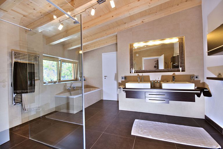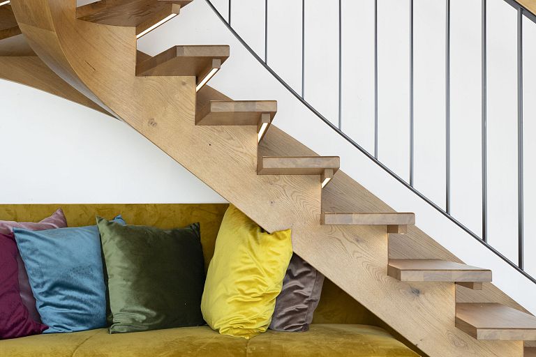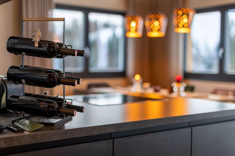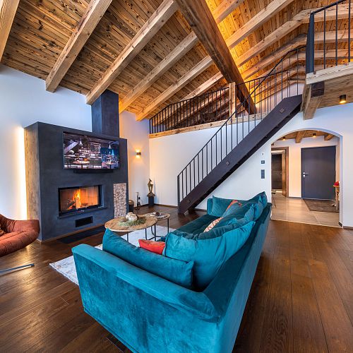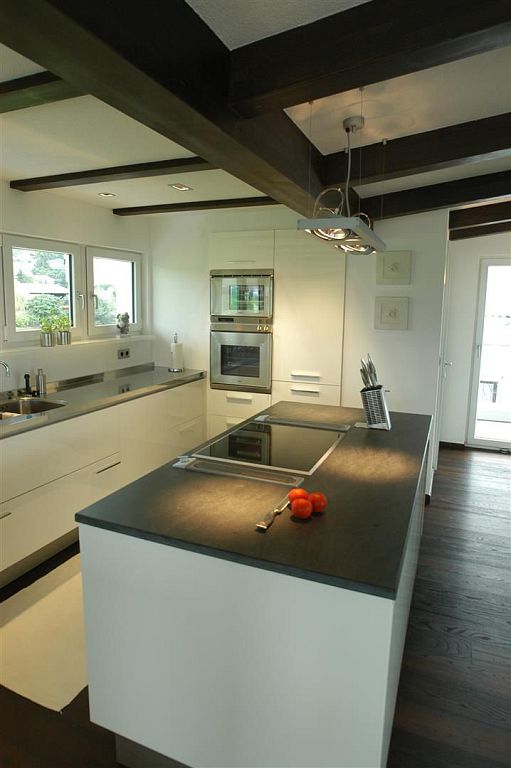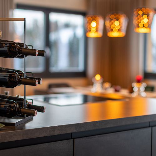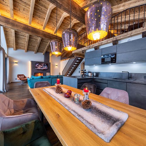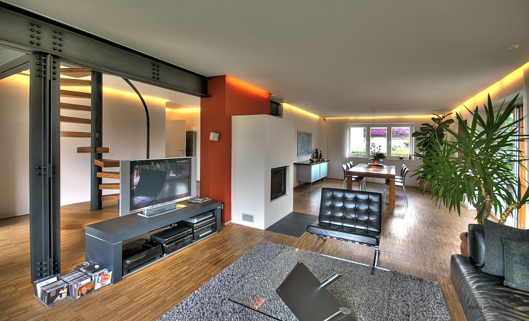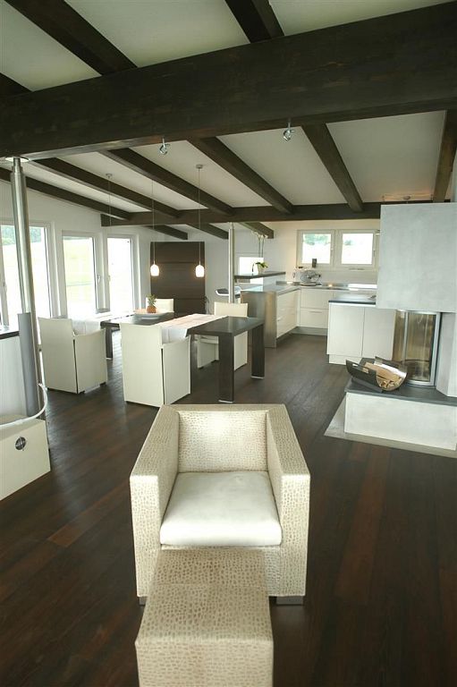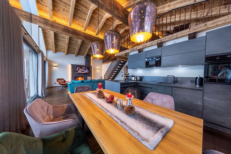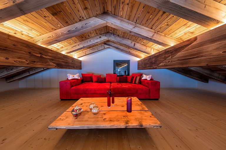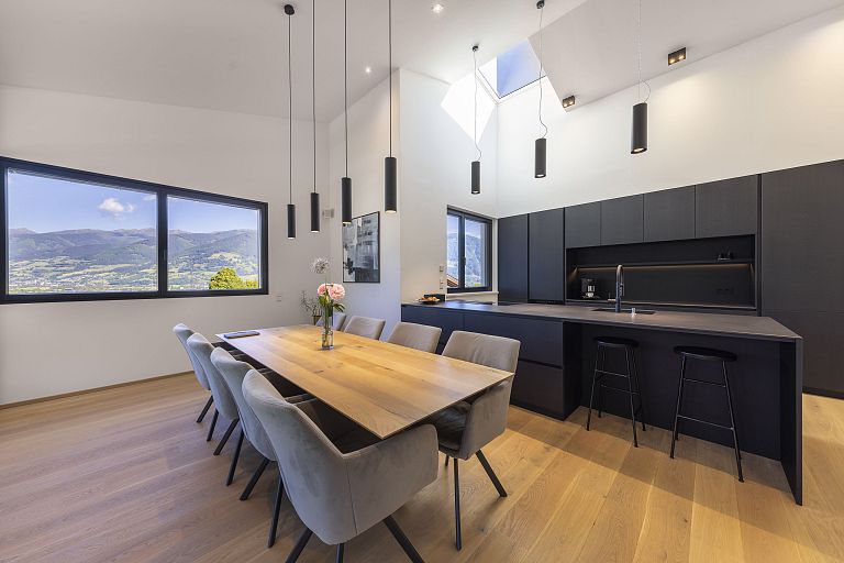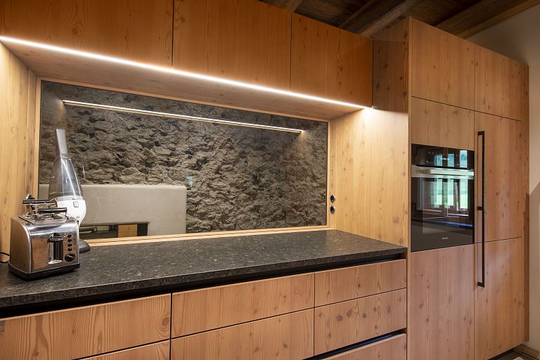 uach der Einrichtung samt Treppe die Gesamtumsetzung gemacht. Die komplette Untersicht des Dachstuhles wurde in Altholz verkleidet. Weiters schaffen Dachflächenfenster und Gaupen eine helle, gemütliche Atmosphäre. Weitere Highlights sind die markante Eichenholztreppe mit unterleuchteten Stufen und dem edlen Schwarzmetallgeländer und die glasüberdachten Dachterrasse samt Lärchenholzboden. Von den handgehobelten Eichenholzdielen über die Innentüren mit Quermaserung bis hin zu den Altholzmöbeln und der Küche nach Maß – alles Handwerksarbeit – sind es die besonderen Details, die das Interieur auszeichnen: die Garderobenschränke in Kombination mit stoffbespannten Oberflächen. Die beleuchtete (und sehr einladende) Gläser-Schrank-Bar. Der massive Esstisch mit handgeschmiedetem Fußgestell. Und nicht zuletzt die Altholzküche mit schwarzem Kochinsel-Monolith. Wie ein Fels in der Brandung des Alltags.