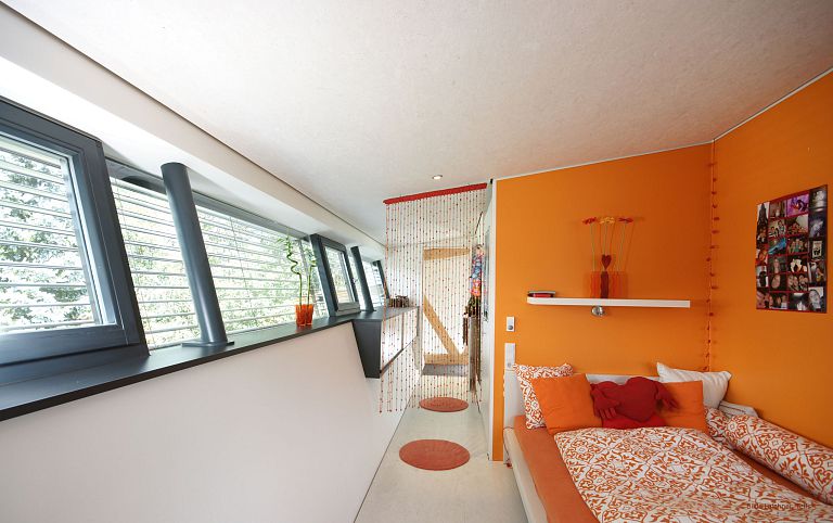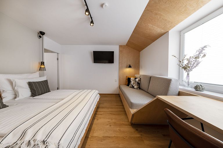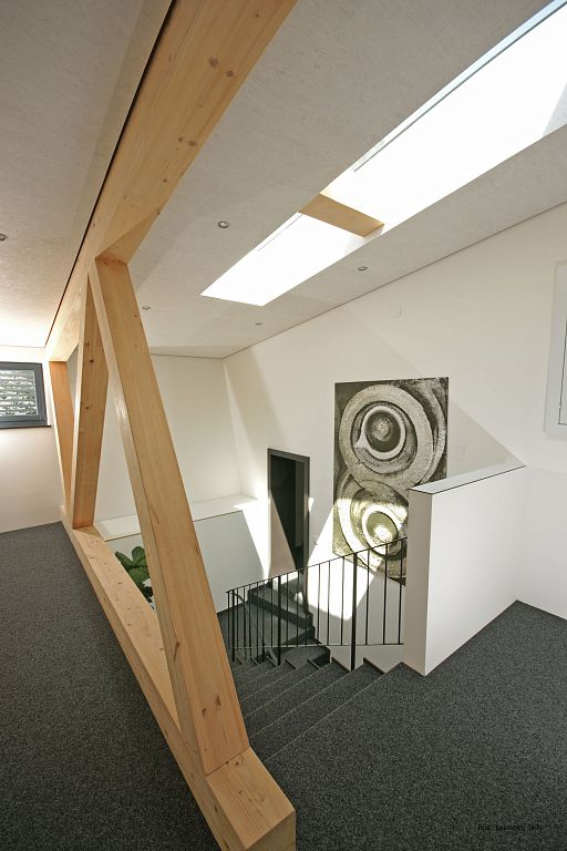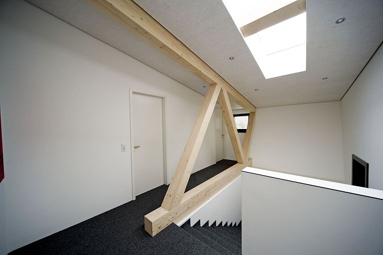 Im Dachgeschoß wurde der Knistock gegenüber dem Bestand auf Raumhöhe angehoben und somit entstand ein leicht auskragendes drittes Geschoss ausgeführt mit vorgefertigten Holzriegelwänden.