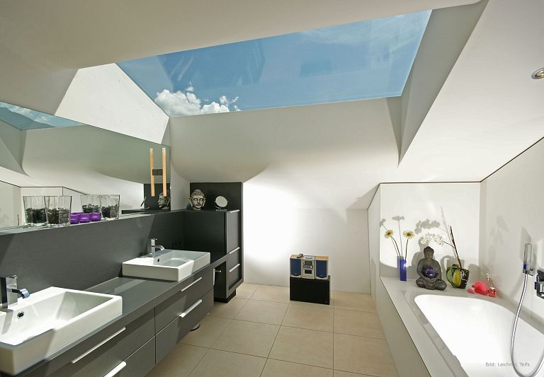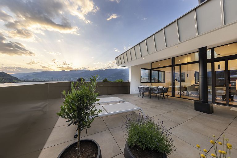 Durch einen Dacheinschnitt im westlichen Bereich der Aufstockung entstand eine großzügige Terrassensituation zu welcher hin der Wohnraum komplett mit Glaselementen geöffnet wurde – somit verschmelzen der Innen – und Außenwohnraum.